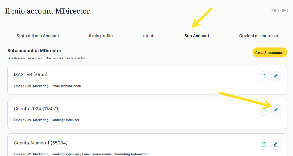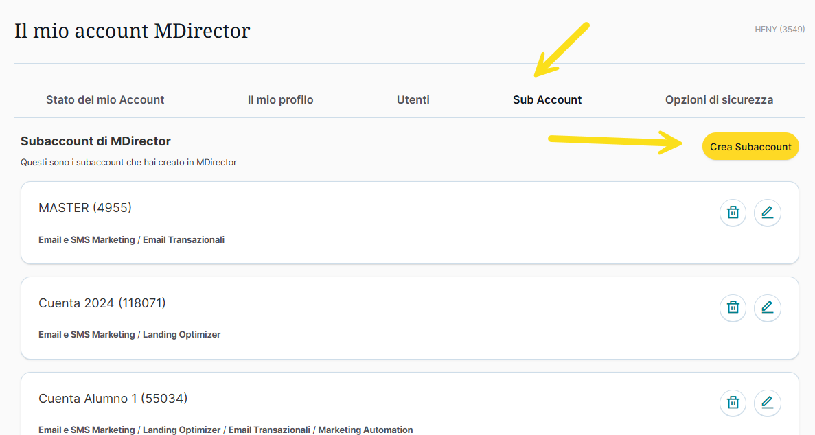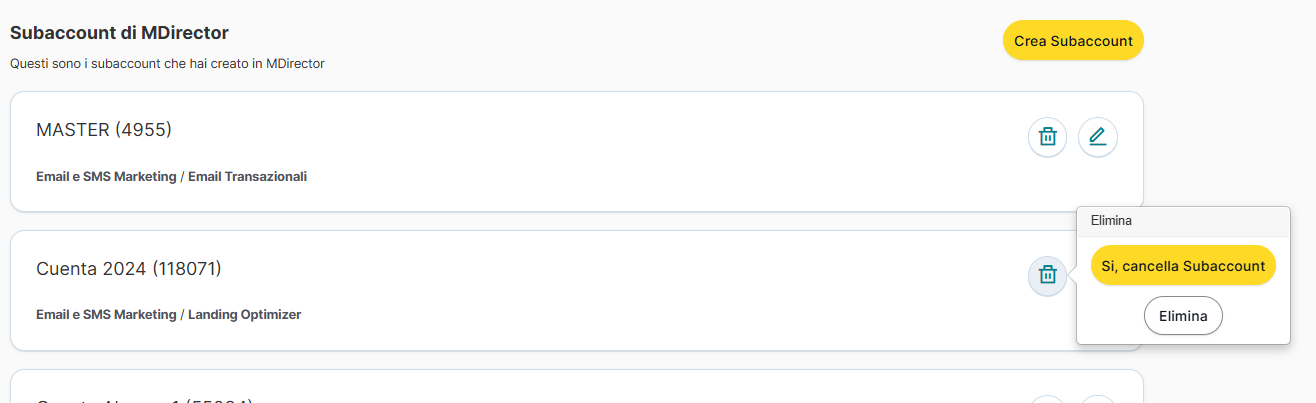 Ecco i passaggi per vedere, creare e modificare i subaccount in MDirector: