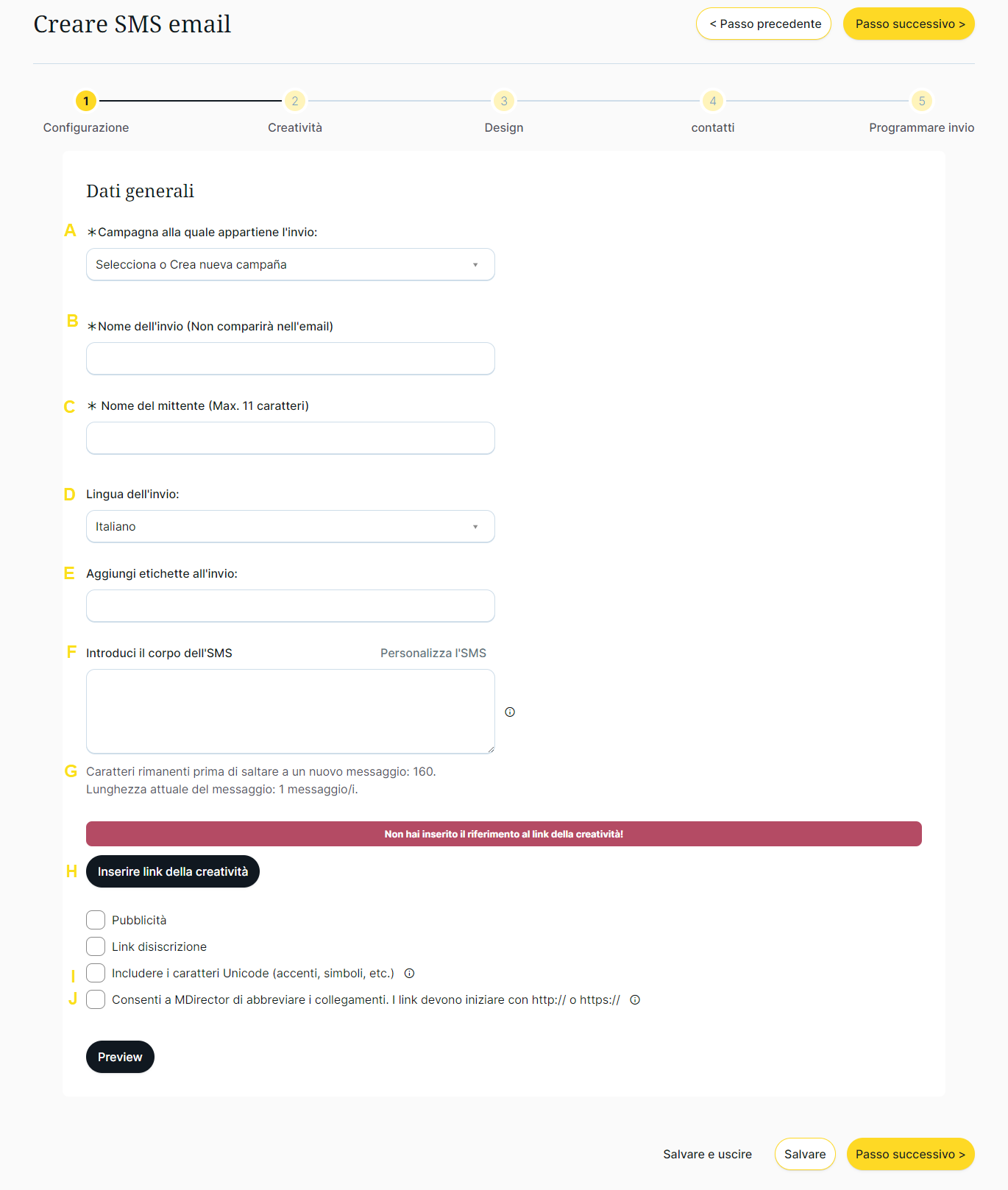 H- Pulsante che incorpora al SMS la url della creatività [----SMS----URL----], devi tenere in considerazione che questo campo è sostituito da una url accorciata quando devi calcolare i caratteri rimanenti nel SMS.