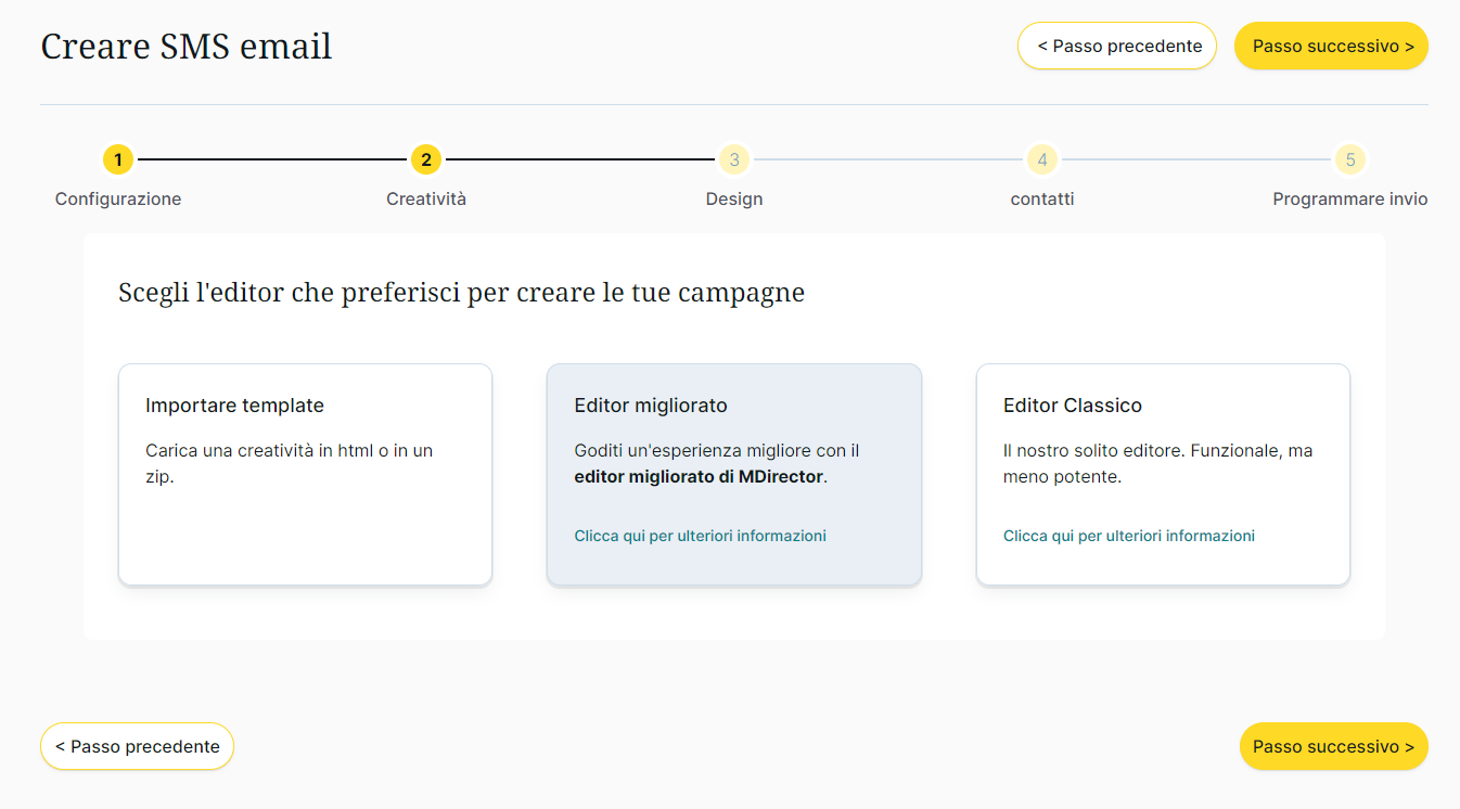 Facendo click su Passo successivo, si passerà al menù dei template. Da qui carichiamo la creatività desiderata.