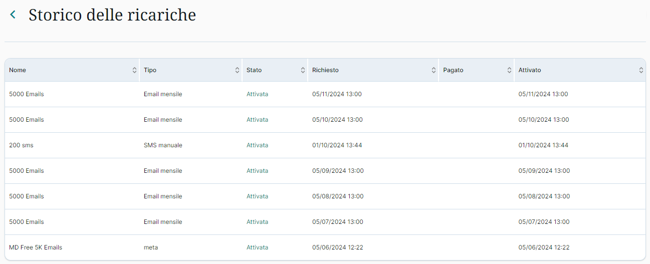 Da qui potrai vedere le ricariche che sono state effettuate e lo stato delle ricariche: se sono state attivate o se non sono ancora state effettuate.