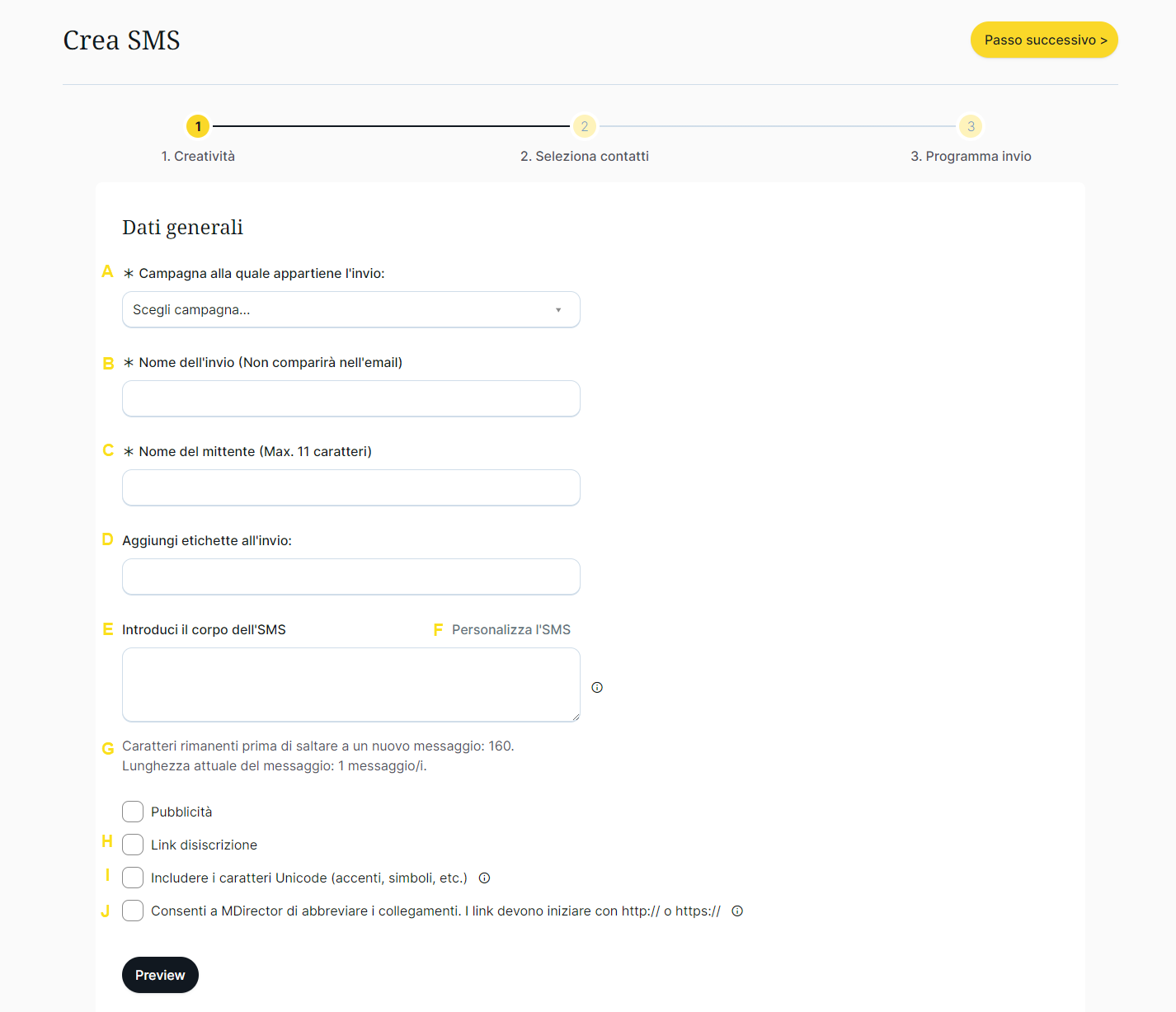 G.- Istruzioni per l'invio: un SMS può contenere al massimo 160 caratteri, permette di includere la pubblicità.