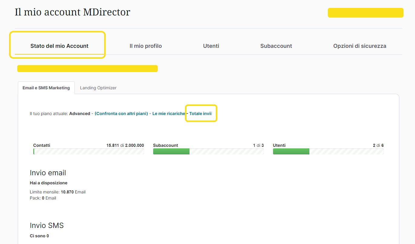 2. Andare nella sezione "Sto del mio account" sulla scheda EMAIL e SMS Marketing e fare click su "totale invii" e apparirà la sezione relativa al riassunto degli invii.