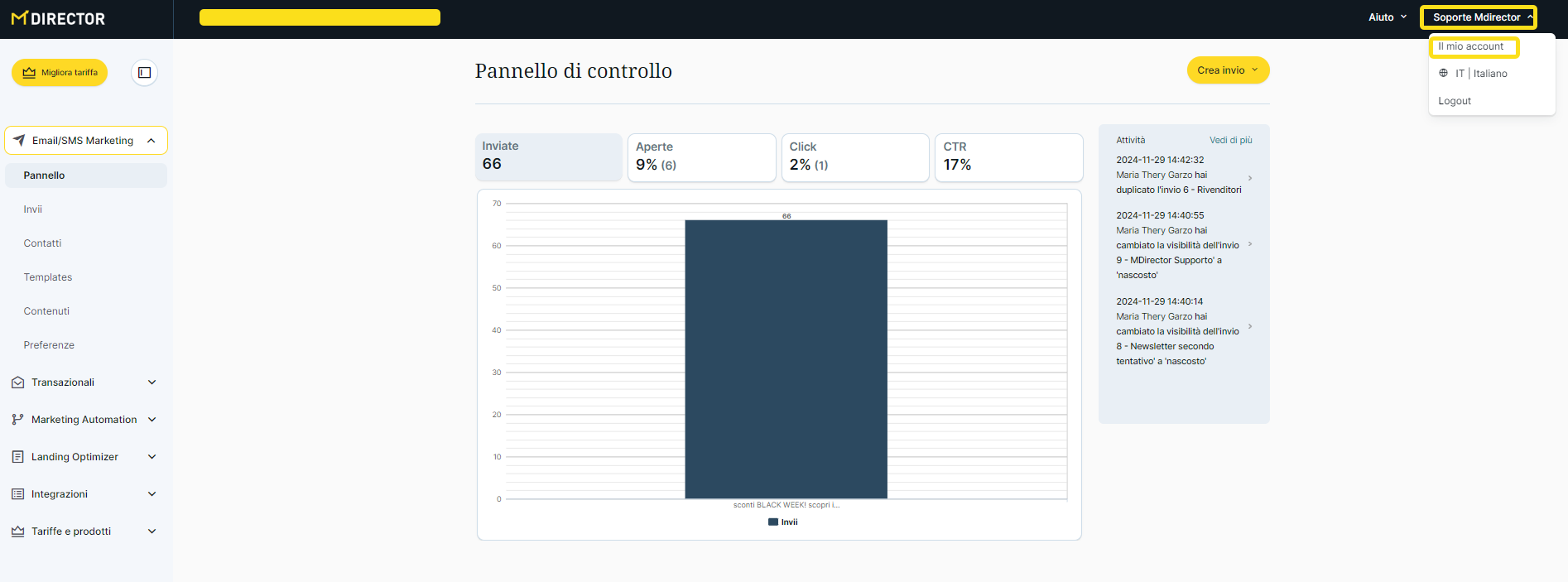 1. Fare click su Il mio conto MDirector dal menu superiore a destra.