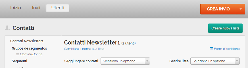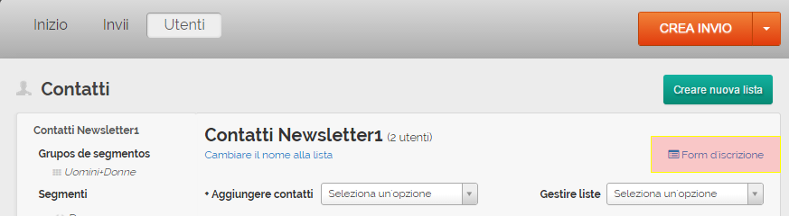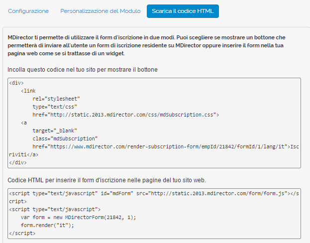 Dalla sezione Contatti del tuo account, hai la possibilità di realizzare un form di iscrizione per ciascuna lista, personalizzarlo e scaricare il codice HTML, in modo molto semplice