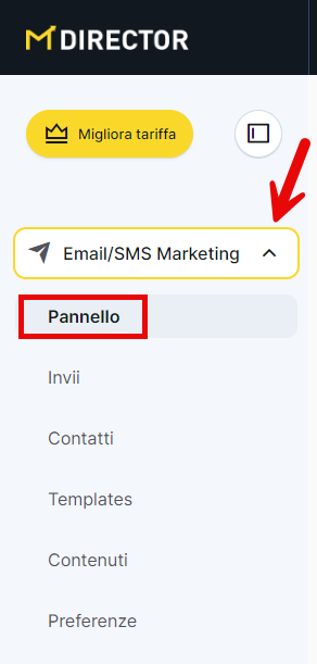 Per accedere al pannello di controllo, devi entrare nella sezione di Email Marketing o SMS nella tua pagina iniziale.