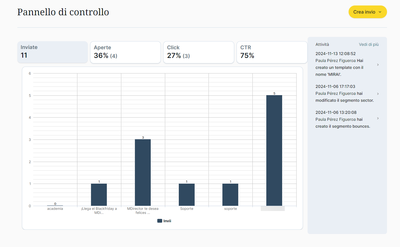 Un Panello di controlllo con le informazioni sugli ultimi invii mostrate in un grafico a barre di facile interpretazione, con i dati corrispondenti al numero totale di invii e le percentuali generali di apertura, clics e CTR.