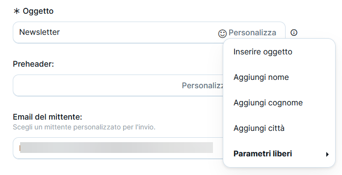 L' oggetto della tua e-mail può essere personalizzato utilizzando i pulsanti posizionati alla destra della cella. In questo modo si avrà la possibilità di personalizzare l' oggetto per qualsiasi campo:standard o su misura