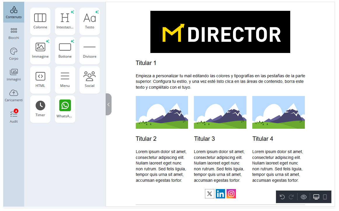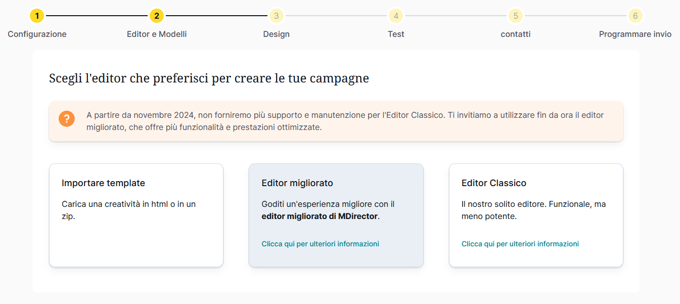 Nel nuovo editor puoi selezionare modelli di MDirector di base o modelli tematici. Puoi anche selezionare i tuoi modelli.