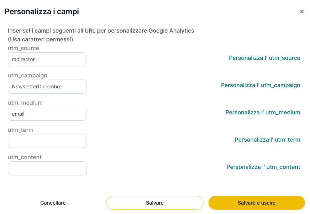 Facendo clic su "Personalizza campi" è possibile personalizzare i campi delle variabili di GA analytics che si desidera introdurre nei vostri link: