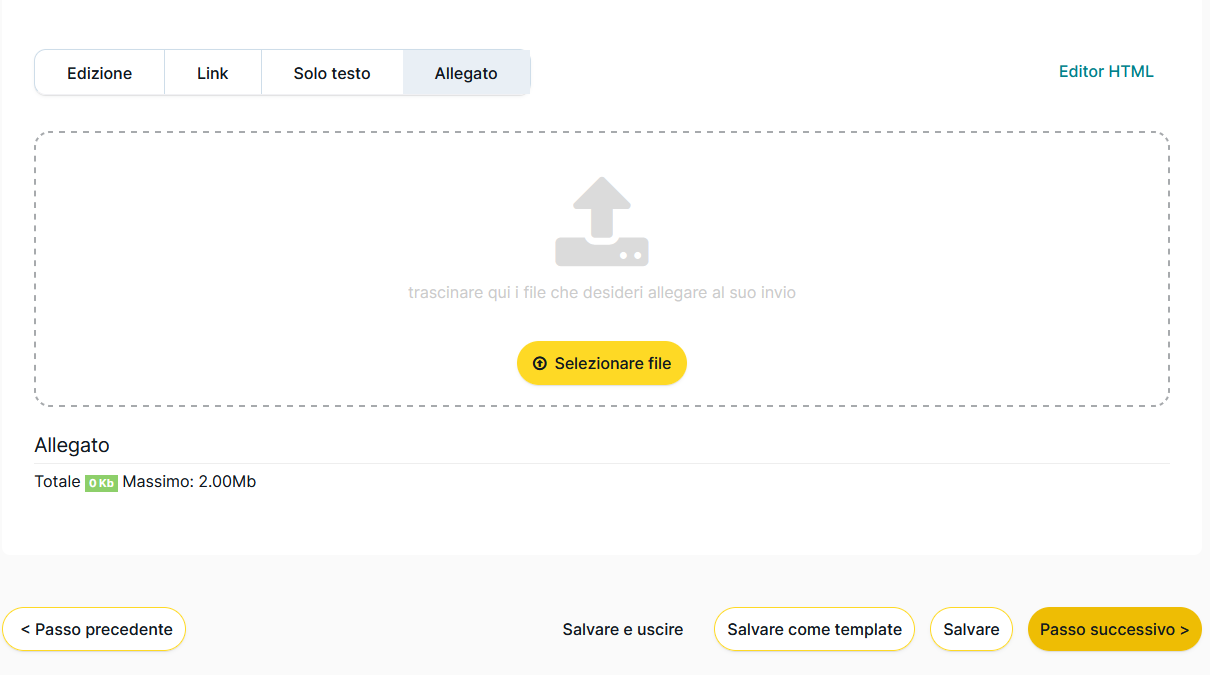 Tramite l' opzione "Allegato", puoi aggiungere un file all' invio; noi suggeriamo di utilizzare un file che non superi il peso di 100kb.Tuttavia, sconsigliamo di utilizzare, per quanto possibile, questa opzione perchè potrebbe pregiudicare l' entrata del vostro invio nella casella di posta, in quanto i robot antispam "non soddisfano" gli invii con i file aggiunti.