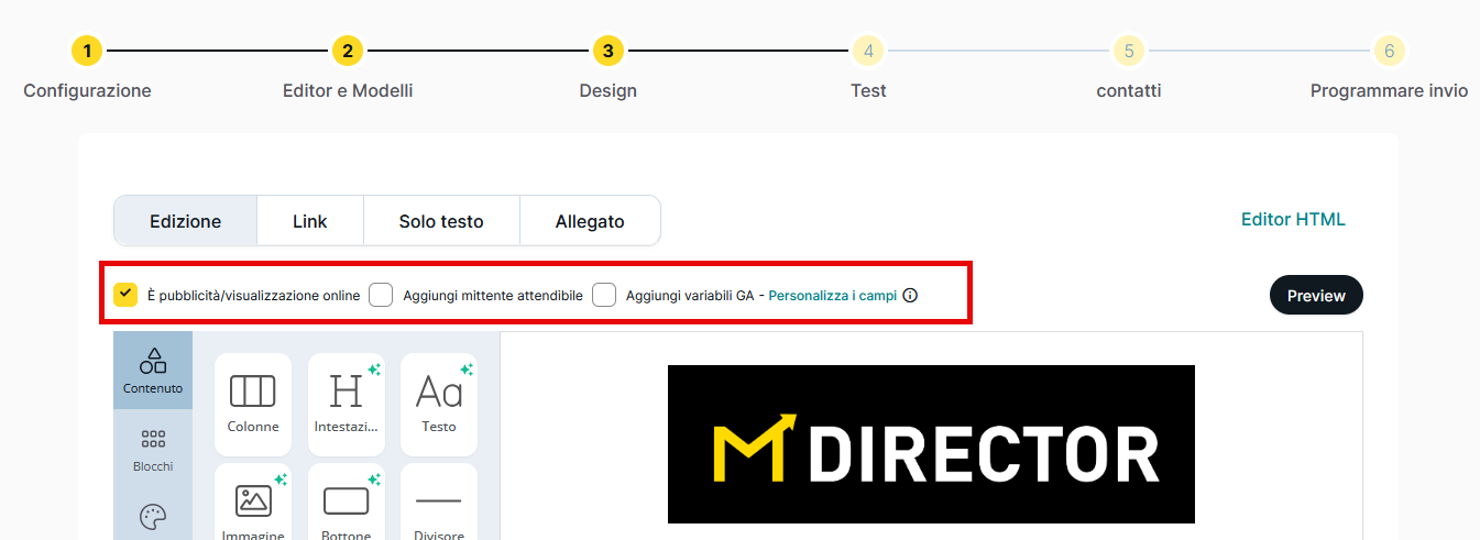 Tramite l' opzione dei link, puoi controllare che siano corretti, nominarli e contrassegnarli come link di vendita; a ogni link corrisponde un palloncino giallo come si può osservare nell' anteprima della creatività.