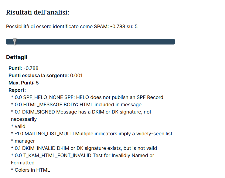 Spamassassin si utlizza per valutare se un invío è considerato come spam o no. Utilizza un sistema di punteggi. Il punteggio di rischio per il quale un invio può essere considerato spam è 5, ma si consiglia che questo sia il più basso possibile. La prova illustra le ragioni del punteggio: