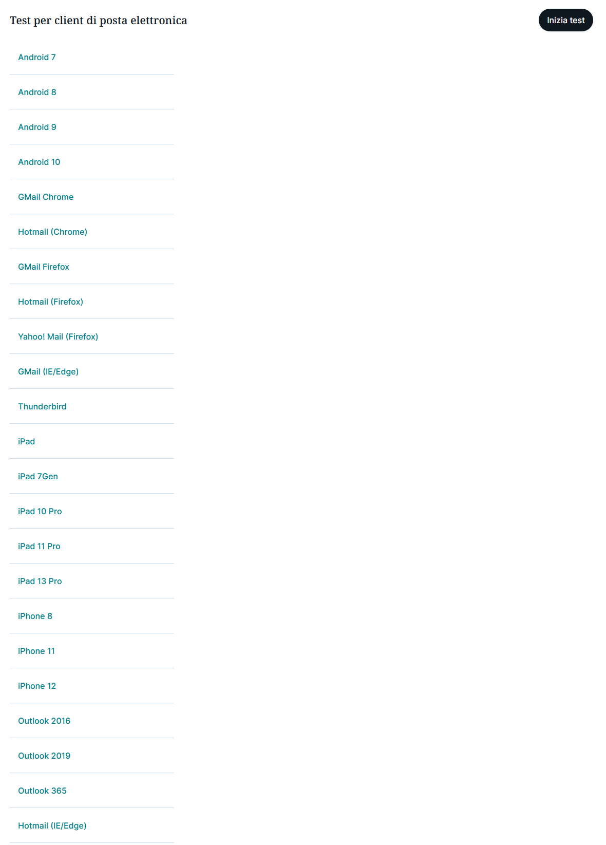 Esso permette anche di avere una visione d'insieme di come la vostra campagna si presenta nella casella di posta in arrivo, anche sui dispositivi mobili: iPad, iPhone, Android, Windows Phone, e desktop di Outlook, Apple Mail, Thunderbird, come Web: Gmail , Hotmail, Yahoo. Vi ricordiamo che ogni client di posta interpreta il codice in modo diverso e anche i vostri progetti possono essere visualizzati in maniera differente; è quindi importante che i vostri iscritti vedano le informazioni inviate con le migliori garanzie.