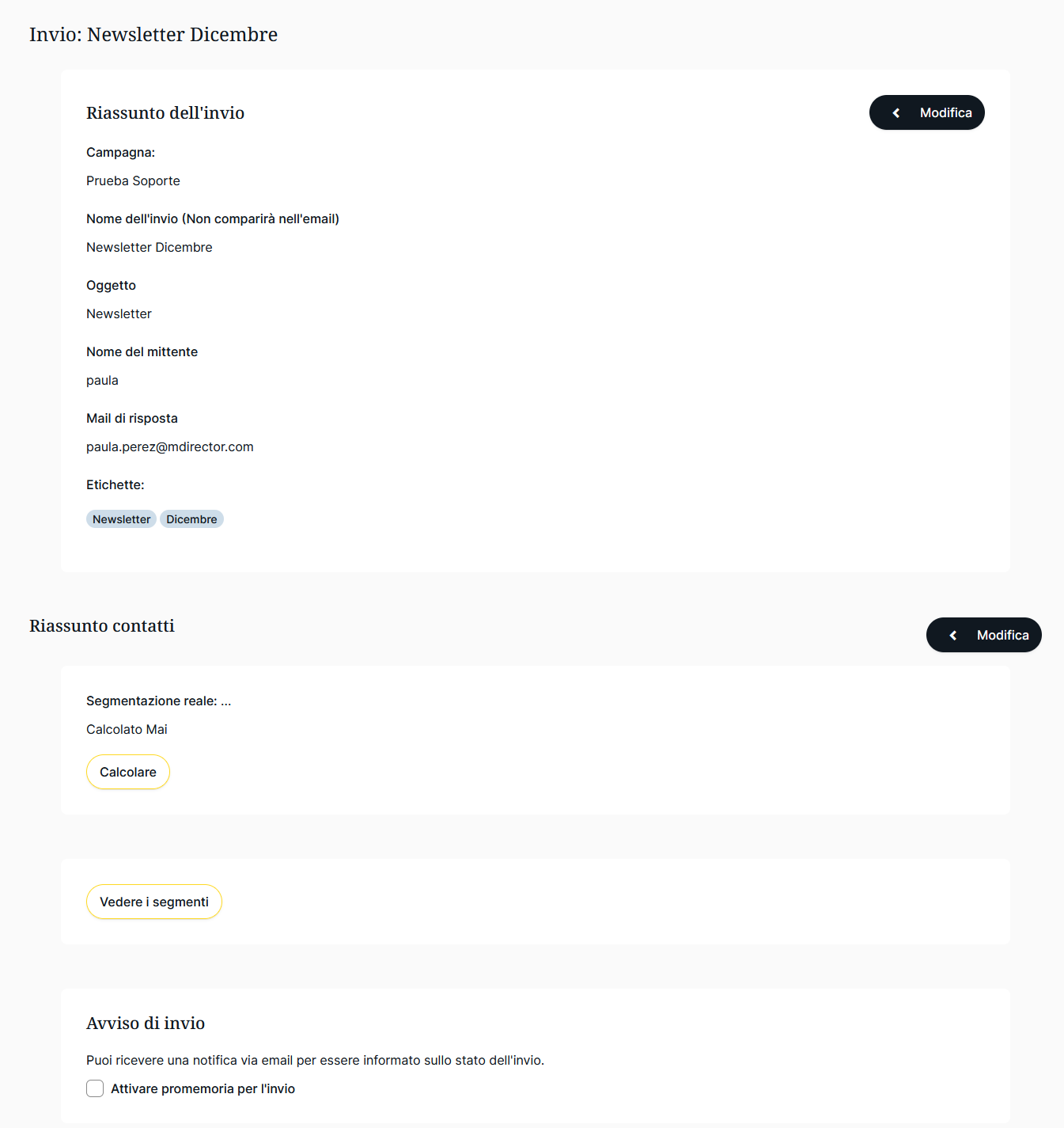 In questa sezione si avrà accesso a una sintesi sia della creatività e sia della selezione dei contatti. Se si vuole cambiare qualcosa prima di essere inviato, fare clic su Modifica: