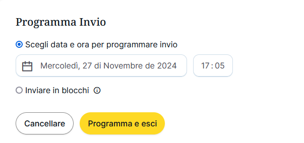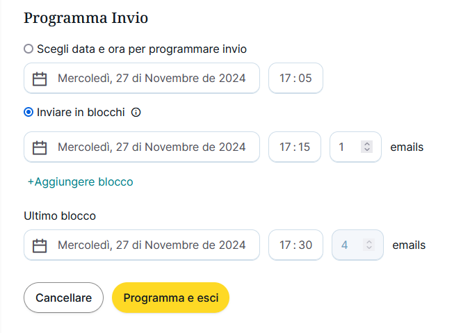 Puoi anche programmare l'invio in diversi blocchi, scegliendo la data, l'orario e il numero di email che vorresti inviare: