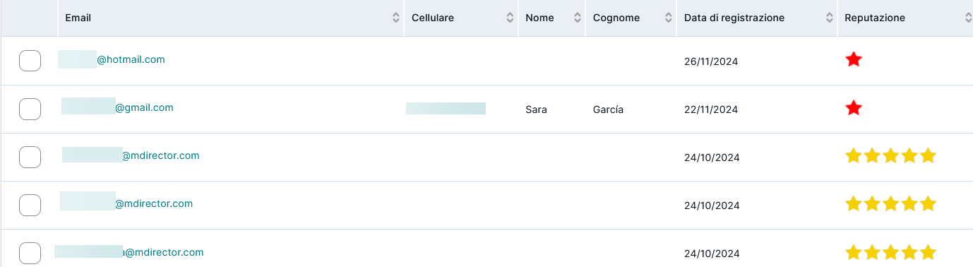 La reputazione va da -1 (stella rossa) a 5 stelle. Quando si registra un nuovo contatto, avrà reputazione -1 fino a quando aprirà una email, dove passerà a 5 stelle. Se il contatto non apre più le nostre email, la sua reputazione calerà arrivando fino a un massimo di 0 stelle, se passano 60 giorni senza aprire una email.