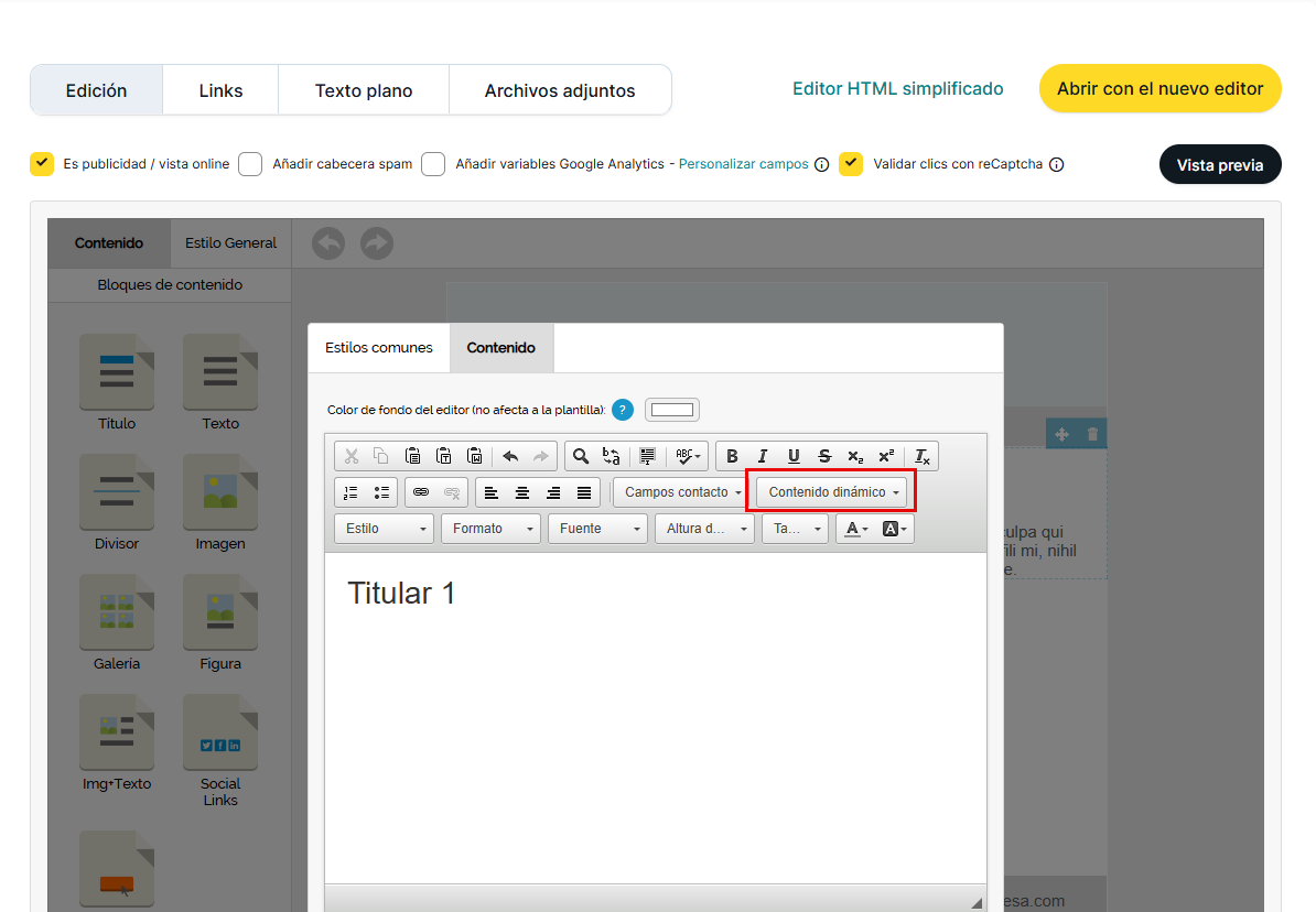 Se ti consideri un utente avanzato e si desideri inserire le condizioni del contenuto dinamico direttamente nell' HTML della creatività dei tuoi invii senza la necessità di dover definire i blocchi di contenuto in precedenza, è possibile farlo. Qui vi forniamo tutte le informazioni in modo da poter creare questi contenuti. https://mdirector.zendesk.com/hc/it/articles/204972691-Contenuto-dinamico-avanzato-HTML