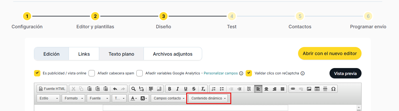 - Se si desidera includerlo in un nuovo messaggio di posta elettronica, fare clic sul pulsante Crea mailing. Seguite le fasi di creazione fino a raggiungere la fase “Progettazione”.