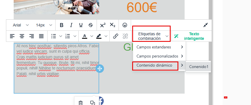 Quando si modifica il blocco di testo in cui inserire il contenuto dinamico, selezionare dal menu a tendina “Tag combinati” l'area di contenuto dinamico creata e che si desidera inserire.