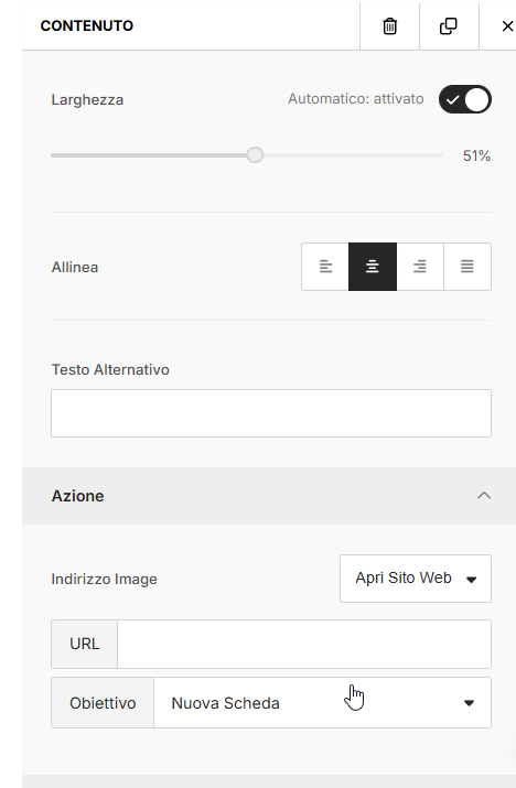 - Dopo il caricamento, potrai configurare opzioni come testo alternativo, link di destinazione e allineamento.