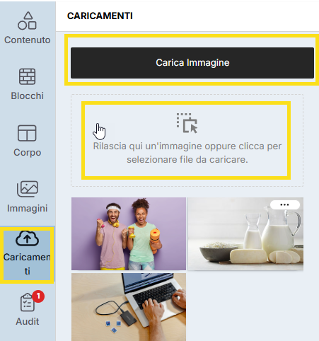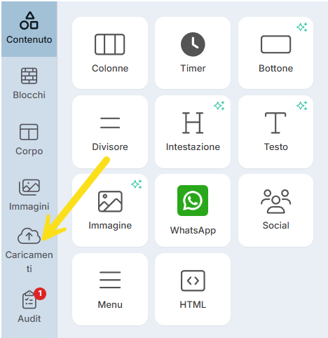- Vai al menu laterale sinistro dell’editor e clicca sull’icona della nuvola con la dicitura “Caricamenti”.