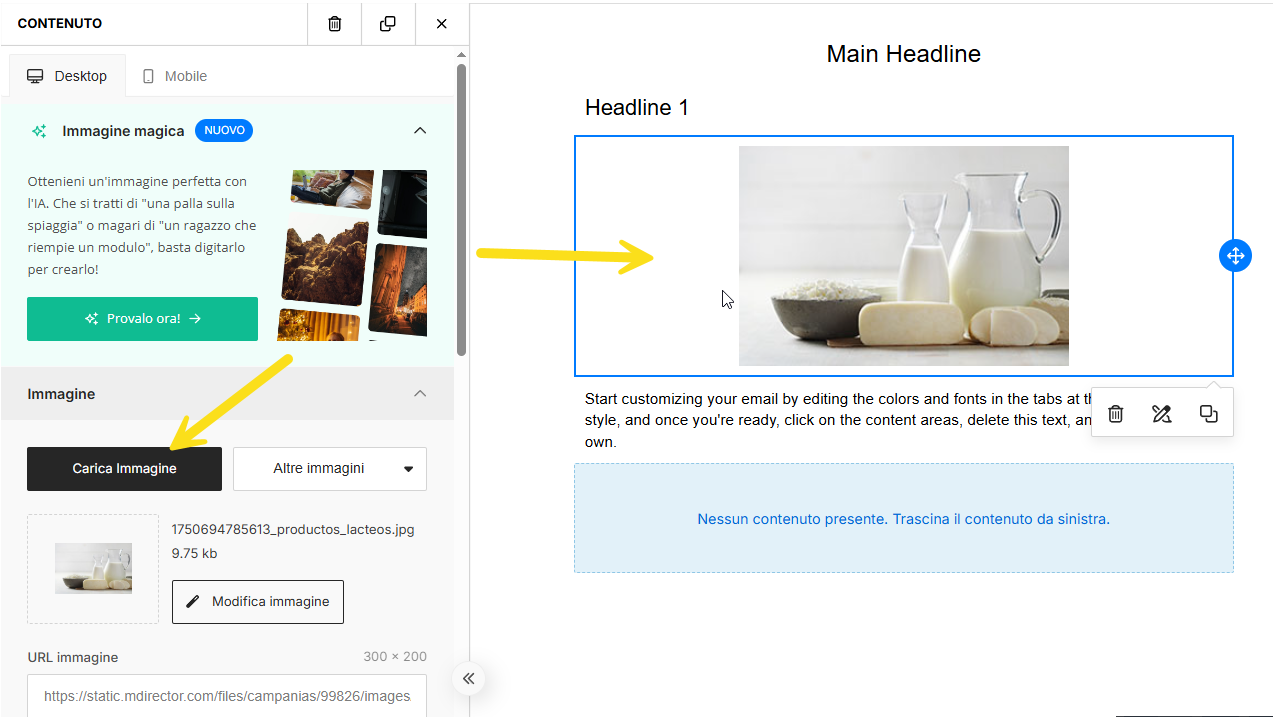 - Una volta caricata, puoi trascinare l’immagine direttamente nel blocco immagine del tuo template.