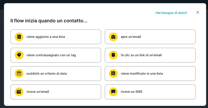 I punti di ingresso di un flow di Marketing Automation in MDirector sono le condizioni che attivano l'inizio di una sequenza automatizzata. In altre parole, quando un contatto soddisfa uno di questi criteri, entra automaticamente nel flow che hai configurato. I punti di ingresso disponibili sono i seguenti: