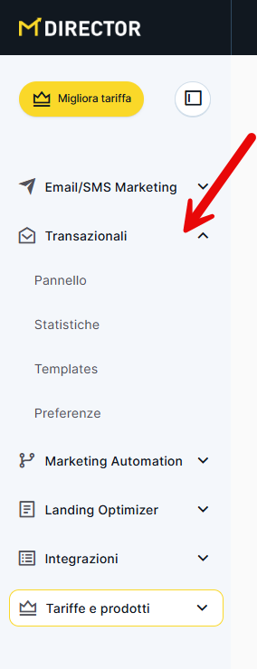 Se disponi di un account Pro o Total, il servizio di email e SMS transazionali sarà attivo nel tuo account. Puoi accedervi dalla barra laterale sinistra.
