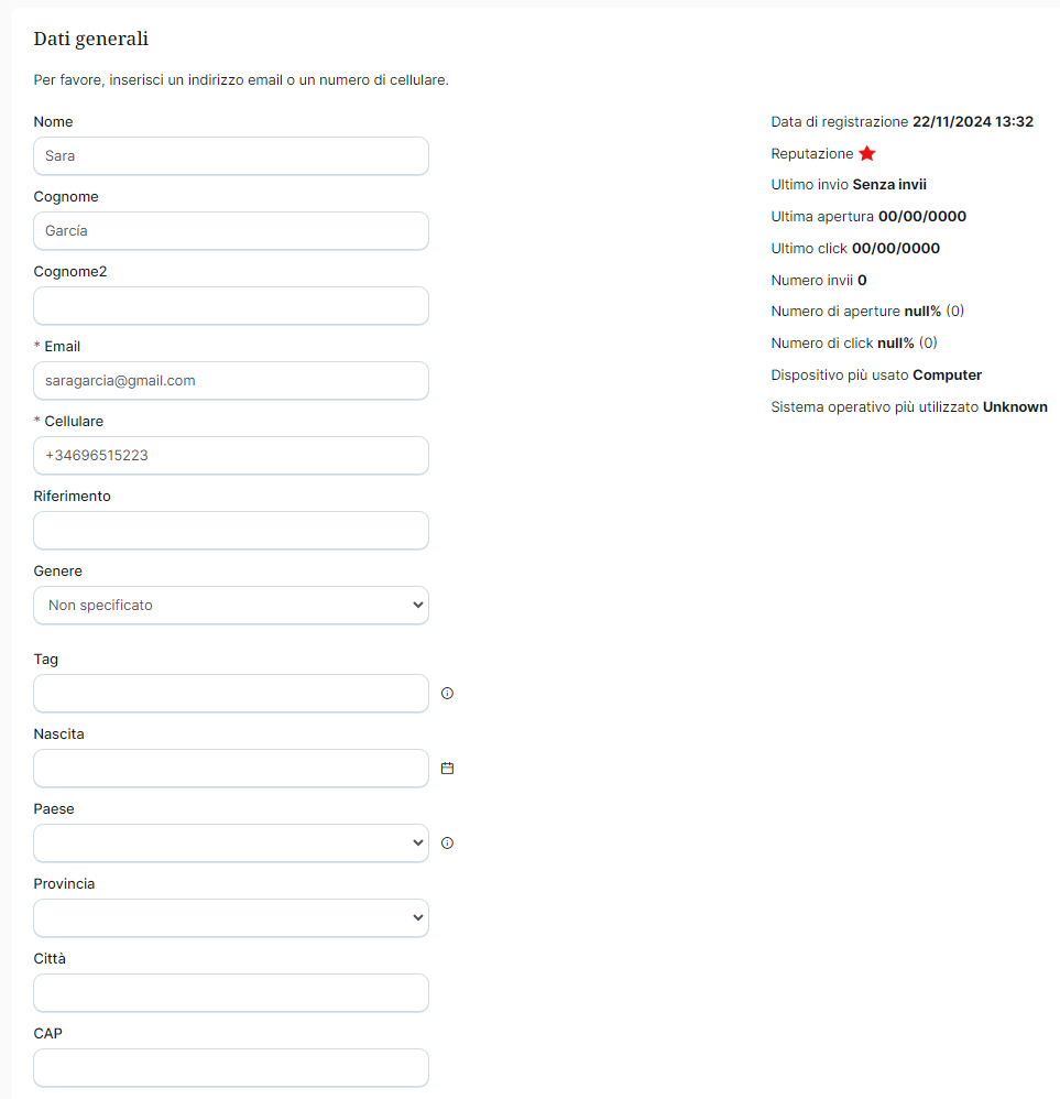 Cliccando sull'indirizzo email di un contatto, è possibile visualizzare tutti i campi, i campi standard: