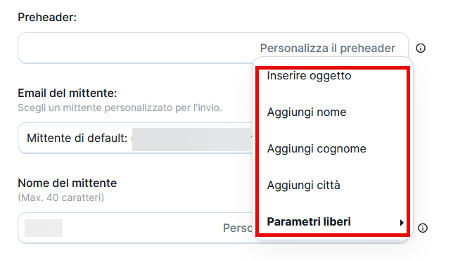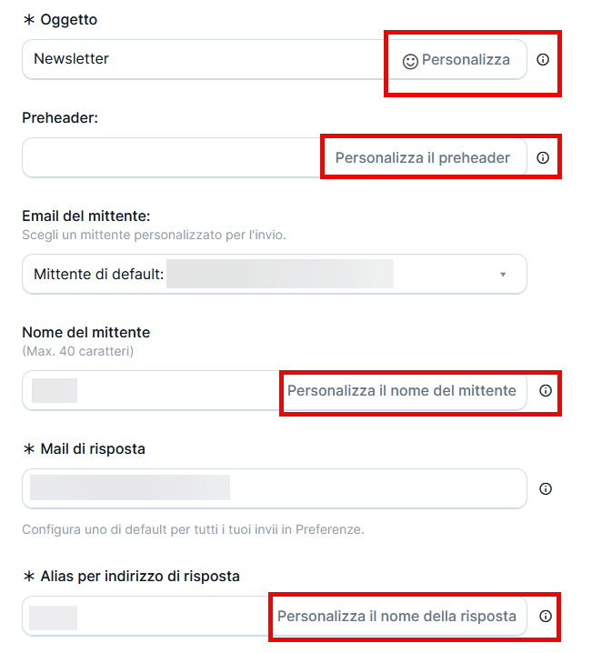 Dal nostro editor potrai personalizzare i tuoi invii con qualsiasi campo contenuto nel tuo database, sia standard che personalizzati.