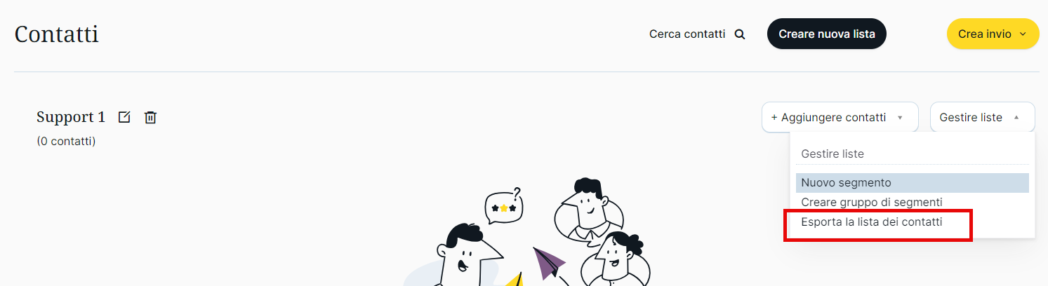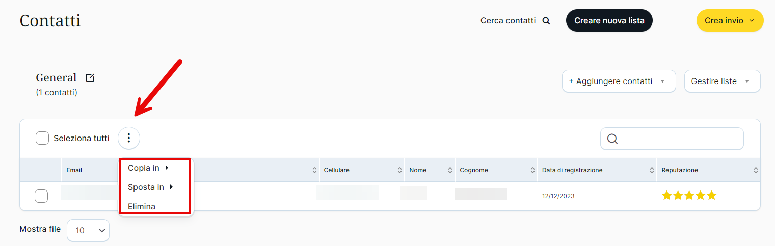Una volta che hai la lista puoi procedere all'importazione dei contatti, una volta caricati i contatti, puoi: