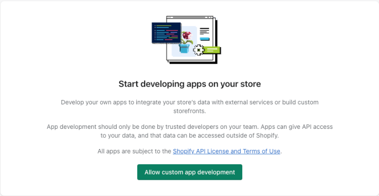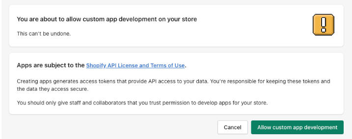 Premi il pulsante "Allow custom app development" per consentire le applicazioni di sviluppo sul tuo account Shopify.