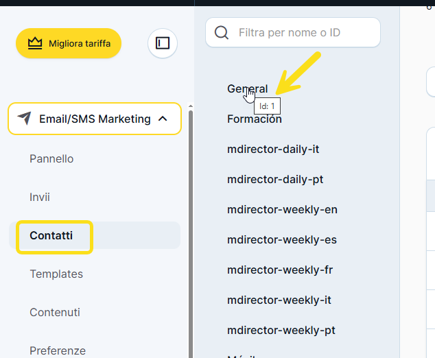 List ID: È l'identificatore della lista a cui desideri inviare i contatti da Shopify a MDirector. (Puoi visualizzare l'identificatore di ogni lista posizionando il cursore del mouse sul nome della lista).