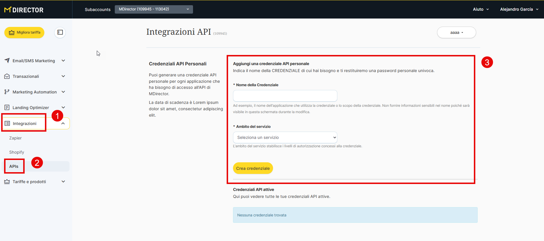 Accedi al tuo account MDirector e vai alla sezione "Integrazioni" facendo clic sul tuo nome in alto a destra.