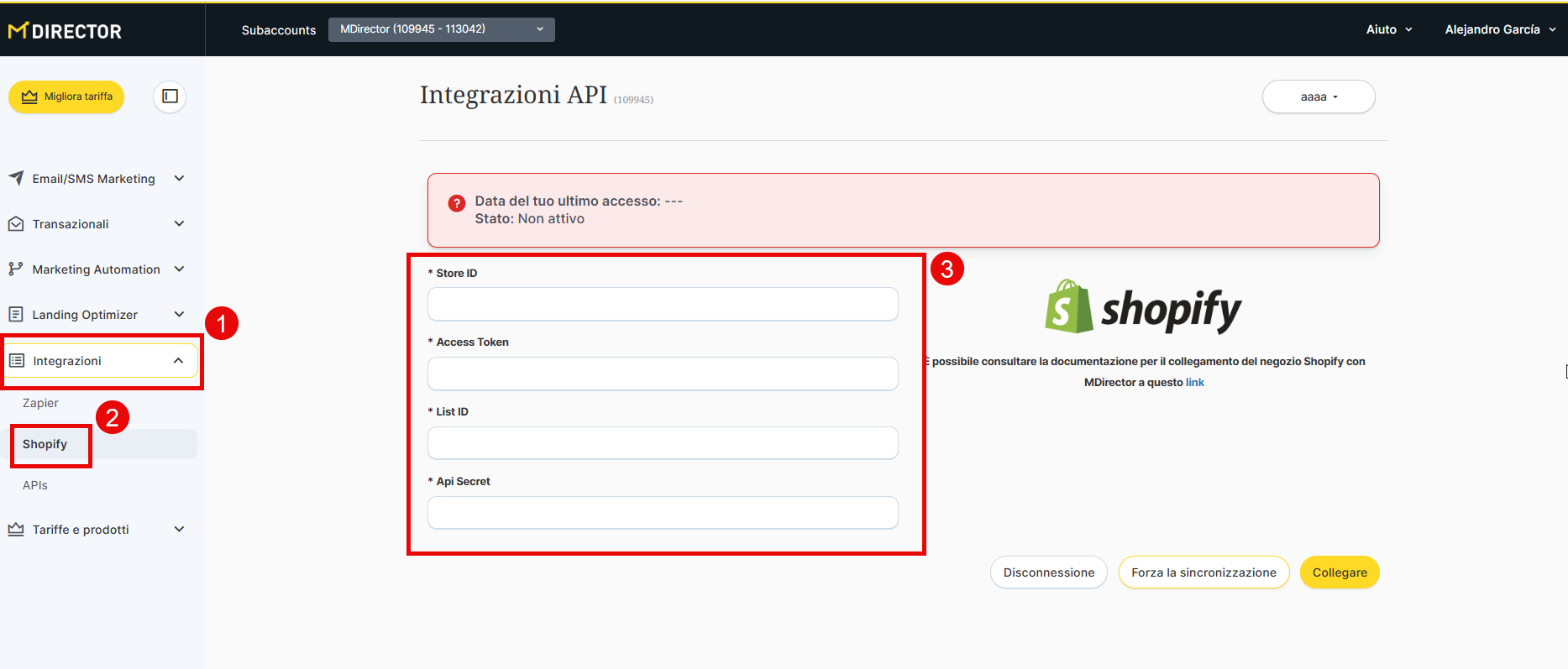 Quando disconnetti l'applicazione, tutti i dati vengono cancellati, quindi è consigliabile salvare le informazioni relative all'API sia da Shopify che da MDirector prima di disconnetterle.