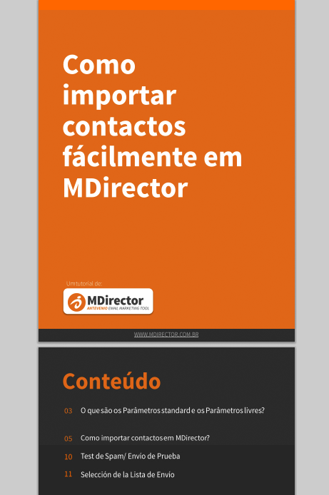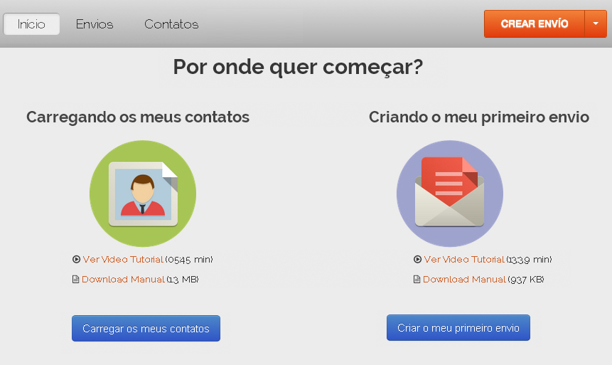 Ao conectar-se a sua conta pela primeira vez (com seu nome de usuário e senha), vai encontrar uma página que chamamos de "Aterrissagem" com as opções de carregar seus contatos e de criar seu primeiro envio.
