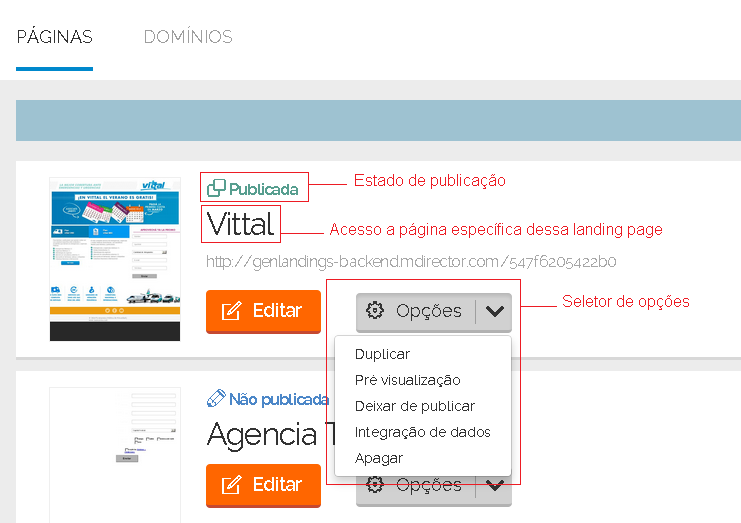 Desde a seção páginas, verá listadas todas as landings que tenha criado com informação do estado (se está ou nao publicada) e acesso a página própria da landing. Além disso, tem a possibilidade de realizar uma serie de ações: duplicar-la, pré visualizar-la, mudar seu estado de publicação ou eliminar-la.
