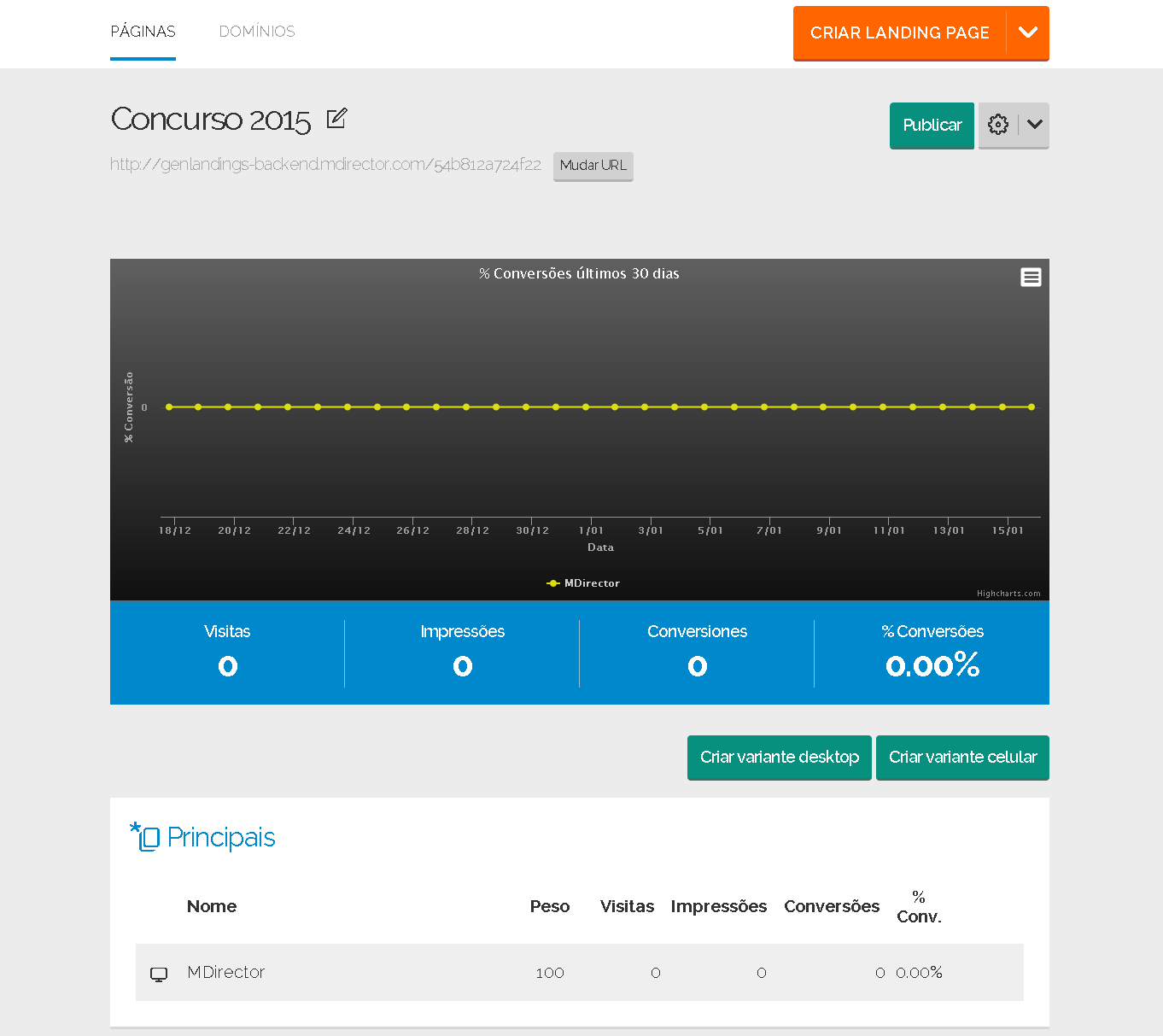 Desde esta página poderá publicar sua landing ou desativar sua publicação, criar variantes da landing para medir sua efetividade e ver as principais métricas: visitas, impressões, conversões e taxas de conversão.