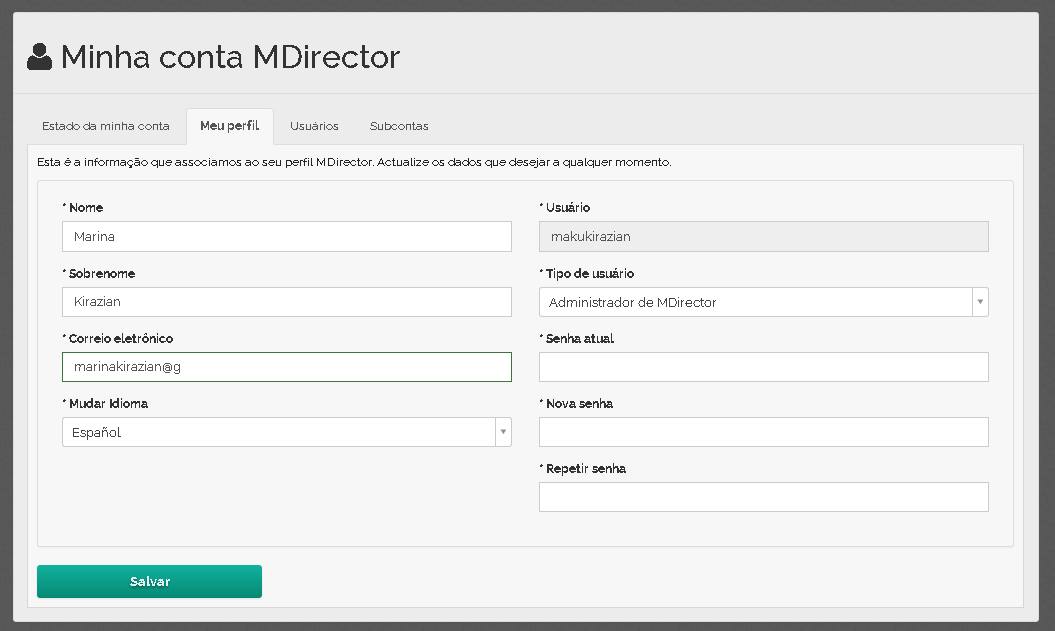 Como Mudar Os Dados De Acesso A Plataforma María Rico Clique no link Minha Conta MDirector Vá à aba: Meu perfil Desde esta página poderá mudar os dados relacionados com sua informação pessoal e os dados de acesso a plataforma. Salvar quando já tenha editado. Tem mais dúvidas? Submeter um pedido Comentários Powered by Zendesk