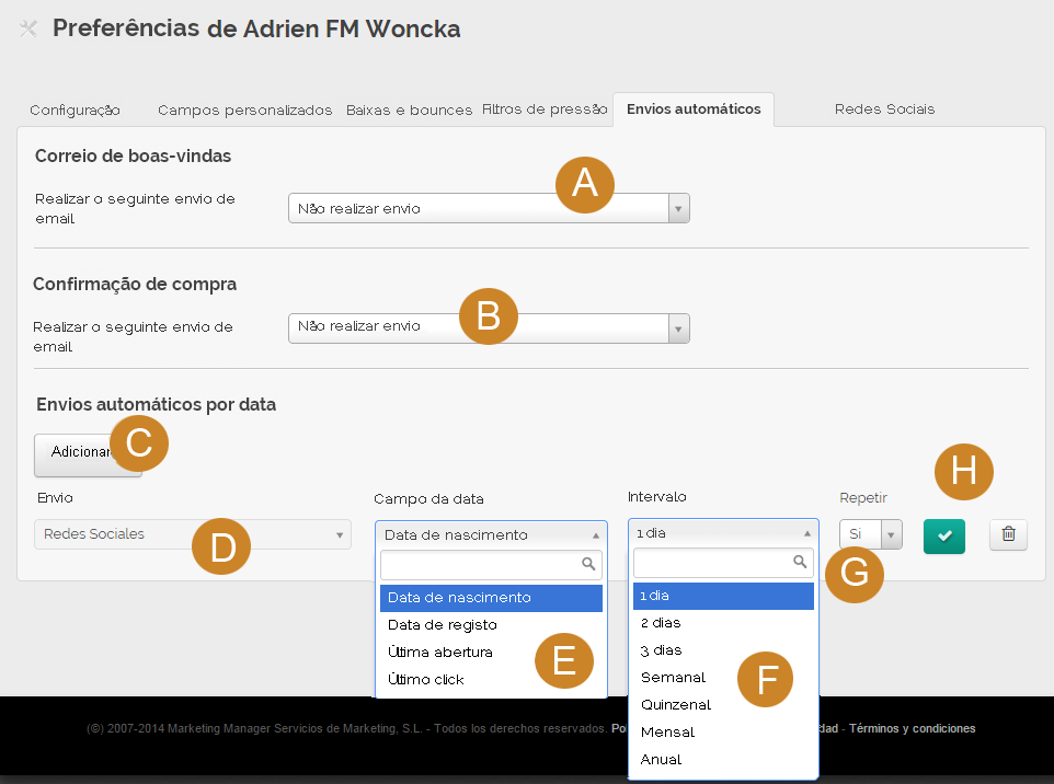 G.- Repetir o envio cada intervalo de tempo, por exemplo: estabelecemos um envio automático por data de nascimento e intervalo anual, se escolhemos repetir "Sim" no menu um email será enviado todos os anos na data de aniversário de seu contato.