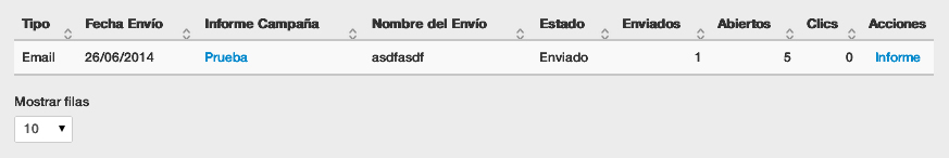 - Lista de envios da campanha (Tipo Envio, Data de envio, Assunto, Estado, Nº enviados, abertos e clics)
