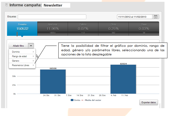 Desta forma, MDirector permite obter relatórios precisos, comparando envios entre si pertencentes a uma mesma categoria de campanhas, com a possibilidade de selecionar uma categoria de tempo em especial assim: