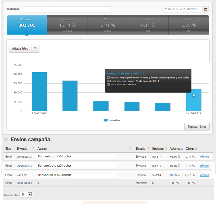 Recorde que cada uma das barras do gráfico é um envio, ao passar o mouse sobre uma de elas, MDirector lhe mostrará informação sobre o assunto, data de envio e total de enviados do mesmo: