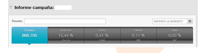 O relatório mostrará, em primeiro lugar, uma media de enviados, aberturas, clics, falhas e baixas dos envios contidos nessa campanha