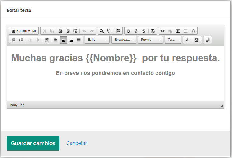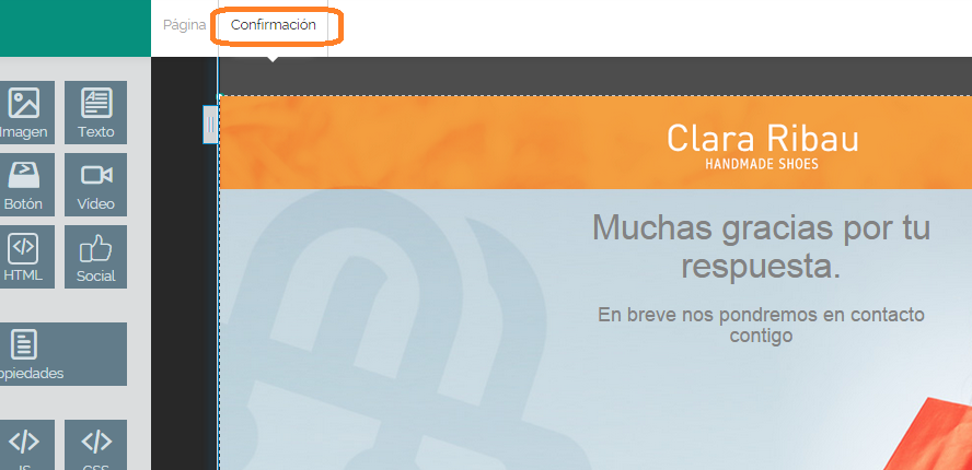 Se na página de confirmação quiser fazer referência a algum campo do formulário da landing, deverá colocar o nome do campo (valor "etiqueta") entre 2 chaves iniciais e 2 chaves finais {{CAMPO}} , como é mostrado no seguinte exemplo: